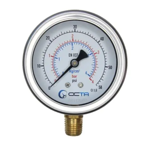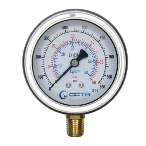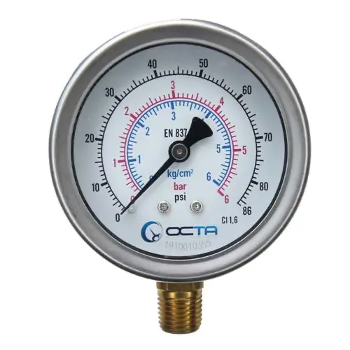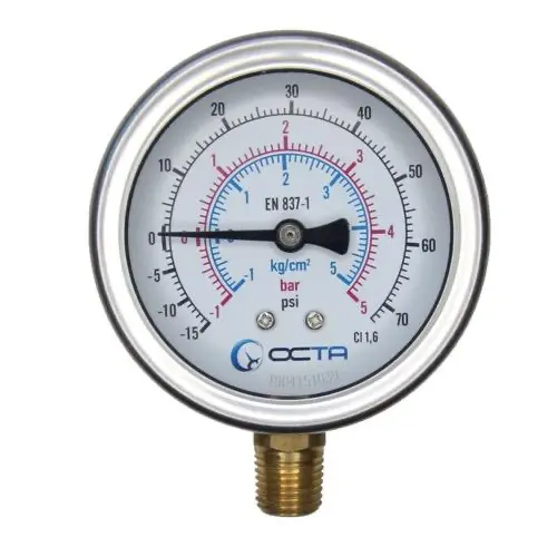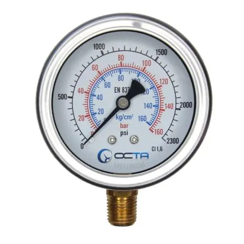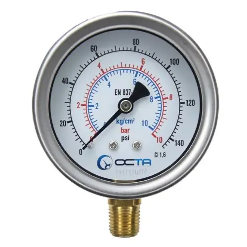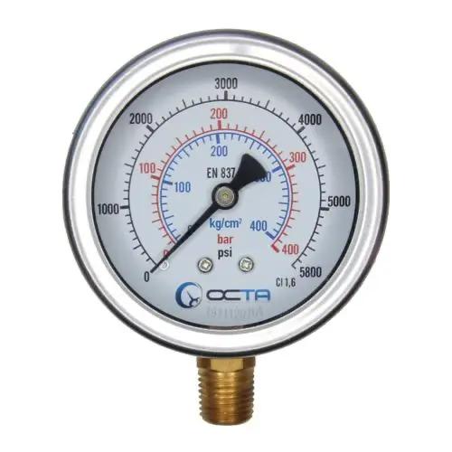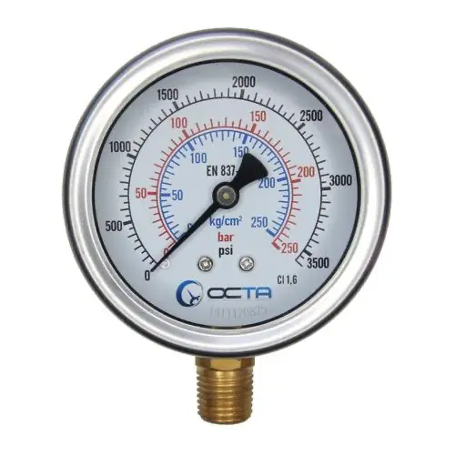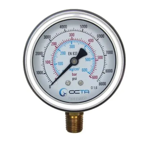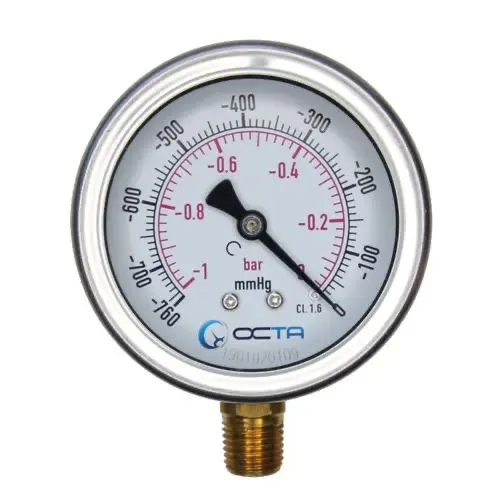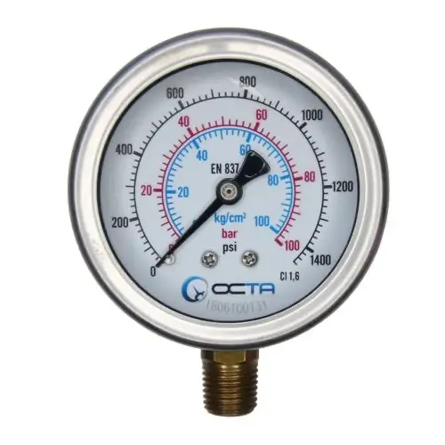 Pressure Gauge แบบ Analog รุ่น GB63 จากแบรนด์ OCTA เกจวัดแรงดันบูร์ดองคุณภาพสูง ที่ออกแบบหน่วยวัดความดันมาให้ถึง 3 หน่วย ได้แก่ bar, psi และ kg/cm2 มาพร้อมหน้าปัดขนาด 2.5 นิ้ว บูร์ดองวัสดุทองเหลือง เกลียวทองเหลืองขนาด 1/4 นิ้ว มีย่านการวัดตั้งแต่ -1 bar ถึง 600 bar ทั้งยังรองรับการเติมน้ำมันกลีเซอรีนได้อีกด้วย รุ่น GB63 ถือเป็นเครื่องมือวัดความดันที่ใช้งานง่าย น้ำหนักเบาและราคาถูก ถูกนำไปติดตั้งในโรงงานทั่วประเทศมากกว่า 500 แห่ง
